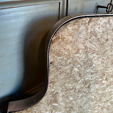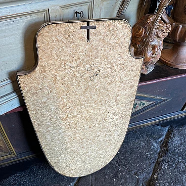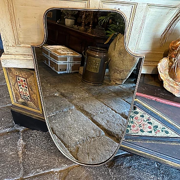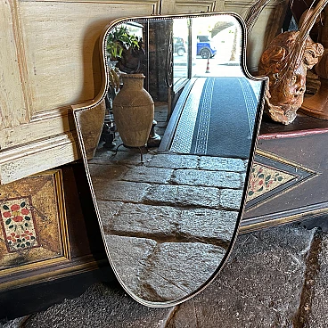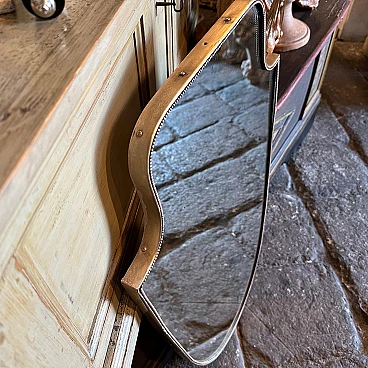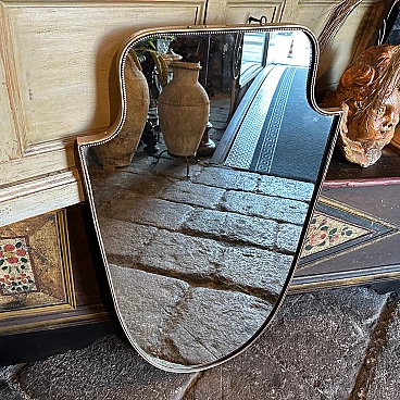 Specchio da parete in ottone massiccio, progettato e realizzato in Italia nello stile di Gio Ponti, che utilizzava questo tipo di specchio nelle più belle case milanesi degli anni '50. L'ottone vanta una bella patina originale, mentre il vetro rimane originale. La forma a scudo, segno distintivo degli specchi di Gio Ponti, ne aumenta il fascino. Questo specchio da parete è uno splendido pezzo di design vintage che incarna l'essenza dell'estetica della metà del secolo, mostrando la miscela di funzionalità, eleganza e influenze moderniste tipica di Ponti. Con la sua presenza audace e accattivante, diventa un punto focale in qualsiasi stanza. La forma dello scudo, che ricorda un'antica armatura, aggiunge un tocco di riferimento storico al design. La cornice dello specchio è realizzata in ottone, un materiale molto diffuso nella metà del secolo scorso. La calda tonalità dorata dell'ottone completa la superficie riflettente dello specchio, creando un effetto visivo armonioso. La struttura in ottone è elegante e minimalista, con linee pulite e una finitura liscia che mette in mostra la semplicità e la raffinatezza del design moderno di metà secolo. Lo specchio stesso è di grandi dimensioni e funge da elemento funzionale e decorativo della stanza. La sua superficie riflettente, chiara e priva di fronzoli, enfatizza lo scopo dello specchio e migliora l'illusione di spazio e luce nell'area circostante. Questo specchio da parete racchiude lo spirito del design degli anni '50, combinando forme organiche e geometriche con materiali di alta qualità per esemplificare l'impegno dell'epoca sia per la forma che per la funzione. Si tratta di un pezzo di design senza tempo che continua a ispirare e affascinare gli appassionati dell'estetica moderna di metà secolo.