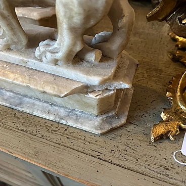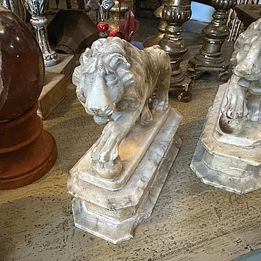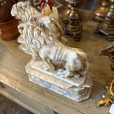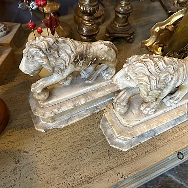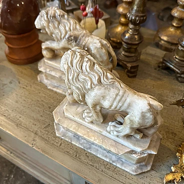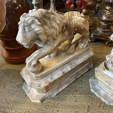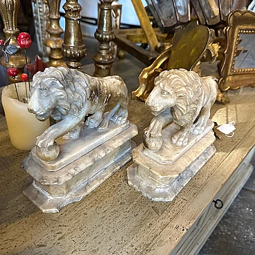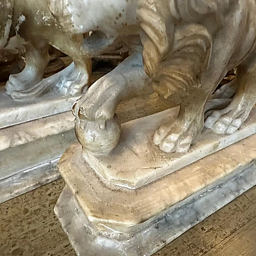 Si tratta di due sculture di leoni in alabastro intagliate a mano risalenti agli anni '70 del XIX secolo, disegnate in stile romano. Ogni scultura presenta un leone in piedi su una base rettangolare, con una zampa appoggiata su un oggetto sferico, un motivo comune nell'arte classica che simboleggia forza e controllo. L'artigianato mostra una criniera dettagliata e tratti muscolari che riflettono l'abilità degli artigiani italiani dell'epoca. Le sculture presentano una patina di tempo, che ne accresce il fascino antico. Probabilmente servivano come pezzi decorativi, forse per un caminetto o una mensola da esposizione. Sono in condizioni originali e in patina, presentano alcune perdite come si può vedere dalle foto.
