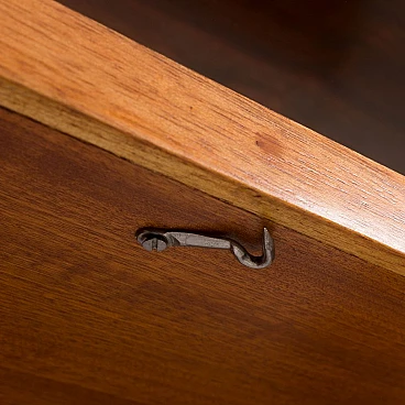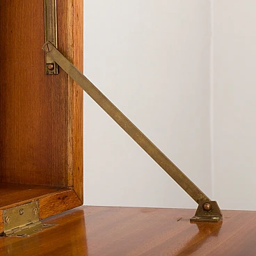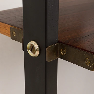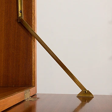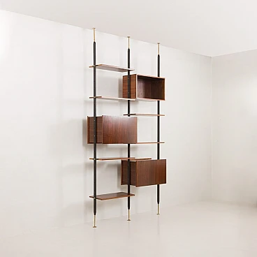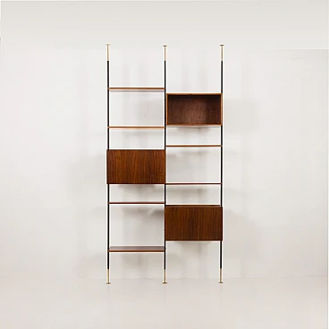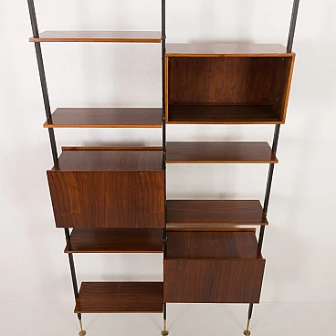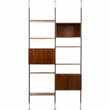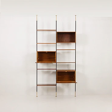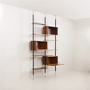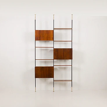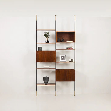 Questo libreria a soffitto o parete attrezzata italiano della metà del secolo scorso, realizzato negli anni '60, unisce perfettamente funzionalità ed eleganza senza tempo. Grazie alle sue dimensioni imponenti, questo mobile non solo riempirà elegantemente gran parte della parete, ma amplierà anche otticamente la stanza. È completamente bifacciale, con armadietti che si aprono su entrambi i lati, una caratteristica estremamente funzionale che consente di utilizzare il pensile come divisorio. Realizzato in ricco legno di palissandro, il pensile presenta un bellissimo motivo di venature del legno sia all'esterno che all'interno dei mobili. La combinazione di guide in metallo verniciato nero, finiture in ottone e l'eleganza del palissandro si armonizzano perfettamente. Il design minimalista permette alla bellezza del legno di giocare il ruolo principale, facendo sì che il pezzo si integri perfettamente con qualsiasi stile di interni. La versatilità è la chiave di questa libreria. I ripiani e gli armadietti, montati su guide metalliche verniciate di nero, sono regolabili, consentendo una facile personalizzazione in base alle proprie preferenze ed esigenze. Possono essere spostati più in basso, più in alto o scambiati, offrendo flessibilità per varie disposizioni. Questa combinazione di scaffali aperti e armadietti chiusi offre un mix versatile di opzioni di esposizione e stoccaggio, rendendola ideale per soggiorni o uffici in cui sono fondamentali sia l'estetica che l'organizzazione. La libreria è montata a pressione tra il pavimento e il soffitto, con un'altezza base di 303 cm. È possibile regolare l'altezza fino a un massimo di 3 cm per garantire sicurezza e stabilità. Il nostro team ha controllato la libreria, che rimane in ottime condizioni originali d'epoca. Ci siamo assicurati che tutti i meccanismi funzionino senza problemi. Gli elementi in metallo e ottone sono stati lucidati. Le parti in legno sono state pulite e ringiovanite con composti professionali. Tutte le piccole imperfezioni, come i segni di patina, sono coerenti con la sua età. Abbiamo scelto di lasciarle perché contribuiscono alla lunga storia del pezzo e non ne sminuiscono l'estetica complessiva. Il set è composto da: 2 armadietti con ante a ribalta: H: 43 cm / L: 73 cm / P: 38 cm (profondità a piena apertura: 77 cm); 1 ripiano incassato: H: 40 cm / L: 70 cm / P: 33 cm; 5 ripiani: L: 70 cm / P: 30 cm; 3 binari di costruzione: 303-306 cm ciascuno.