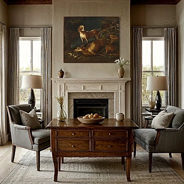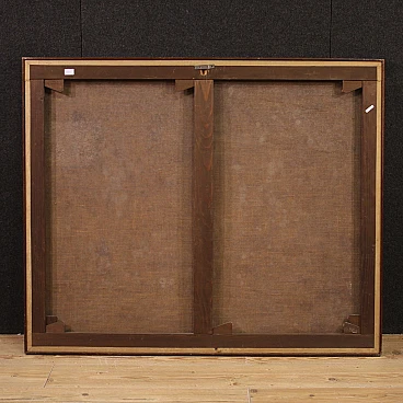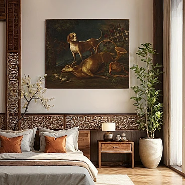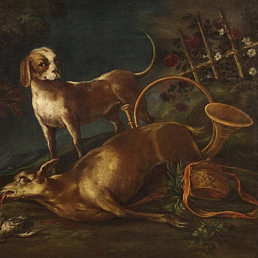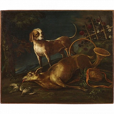 Grande quadro italiano della seconda metà del '700. Opera a olio su tela raffigurante scena di caccia con cane e selvaggina, di buona mano pittorica. In un giardino fiorito troviamo un capriolo e dei volatili mentre il cane da caccia domina il centro della composizione. Presenta una piccola bacchetta in legno del '900, con alcuni segni del tempo. Dipinto già restaurato con rintelo, sostituzione del telaio e ripresa del colore in piccoli punti. Nel complesso in buono stato conservativo. Misure senza cornice: 107 x 130 cm.