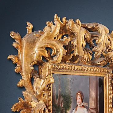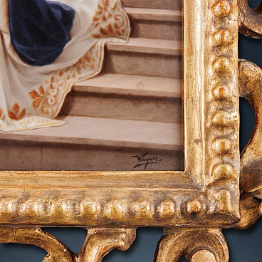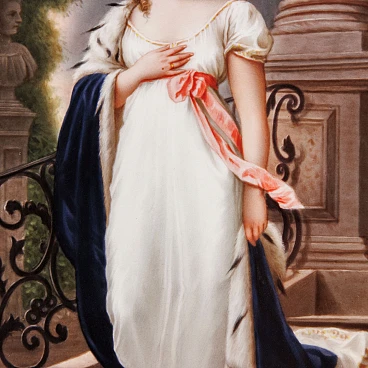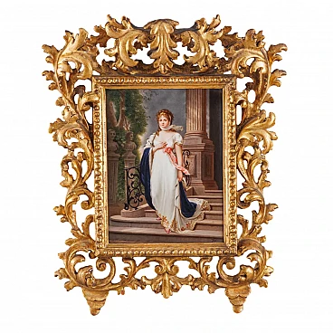 Piastrella in porcellana dipinta. Berlino, ultimo quarto XIX secolo. La delicata porcellana ritrae la Regina Luisa di Prussia (1776 -1810). La regina è abbigliata con un vestito bianco bordato d'oro, di gusto Impero, mentre su una spalla porta un mantello blu foderato d'ermellino; i capelli biondi sono raccolti e trattenuti grazie a un diadema d'oro. Luisa sta scendendo dalla scalinata di un edificio classicheggiante: s'intravvedono il basamento e la parte inferiore di una colonna rastremata, così come al mondo antico guardano le erme in secondo piano, mentre sullo sfondo di vede un paesaggio boschivo. La porcellana è marchiata sul retro con lo scettro reale accompagnato dalla sigla “KPM”, impressi anche “255-195”, “h” e monogramma. Il dipinto è firmato Wagner. Presentata in cornice coeva riccamente intagliata a volute e interamente dorata.