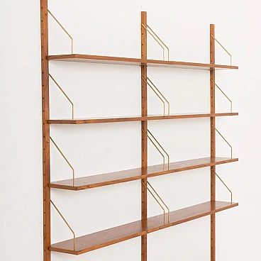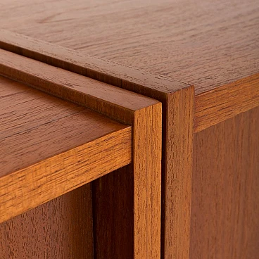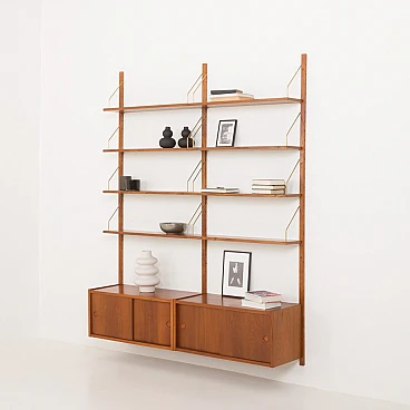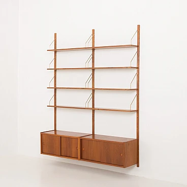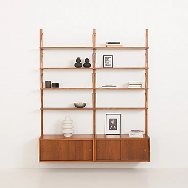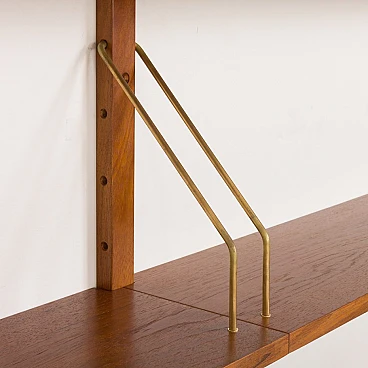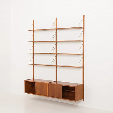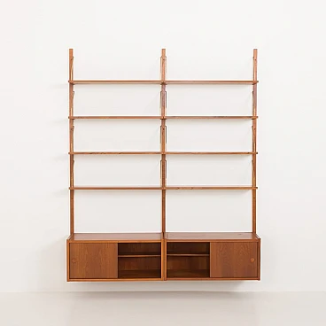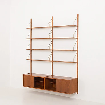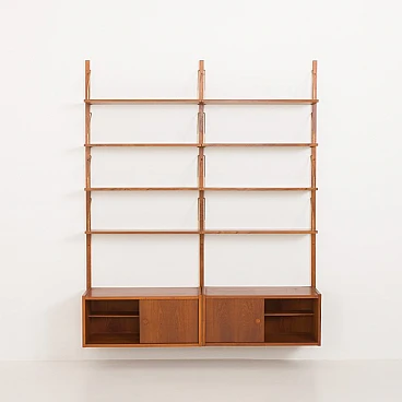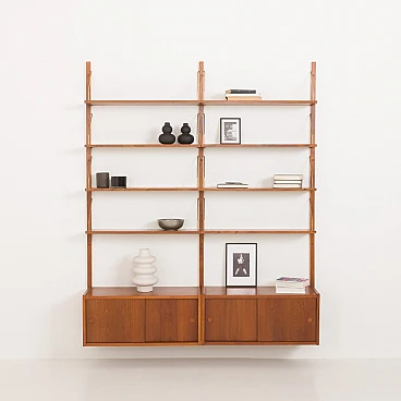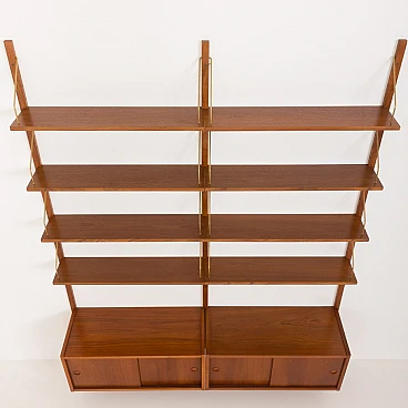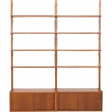 Mobile da parete danese a due vani in teak di metà secolo con due armadi e otto ripiani, progettato negli anni '60, nello stile di Poul Cadovius o Preben Sorensen. Entrambi i designer danesi hanno lavorato parallelamente negli anni '50, '60 e '70. Questo mobile da parete vintage è un sistema di scaffalature completamente modulare. Tutti gli elementi sono larghi 80 cm e possono essere disposti a seconda delle esigenze, posizionati più in alto, più in basso, intercambiati. Questa graziosa composizione può essere sia una bella aggiunta allo spazio ufficio che a una camera da letto o soggiorno.