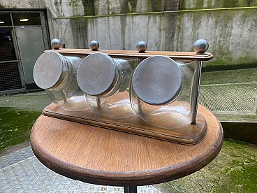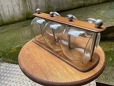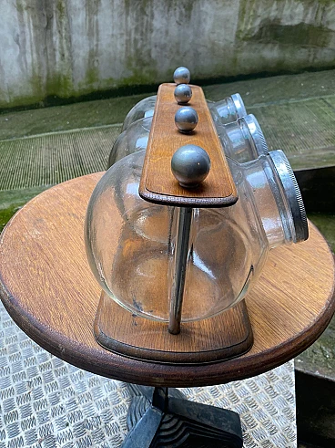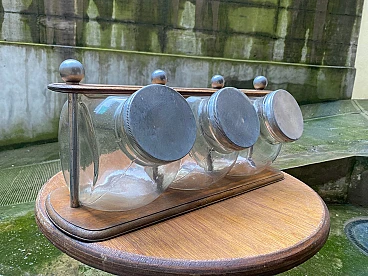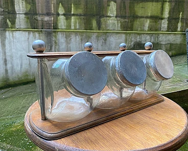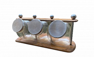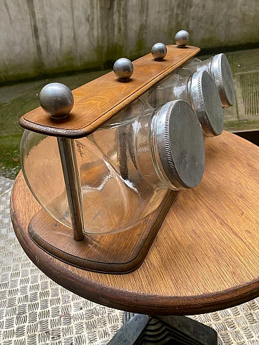 3 Barattoli per biscotti in vetro su supporto in legno, anni '30