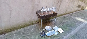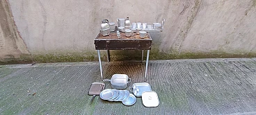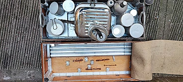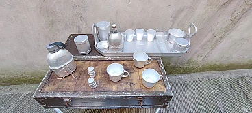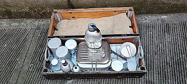 Baule da campo militare con utensili da cucina in alluminio, anni '40