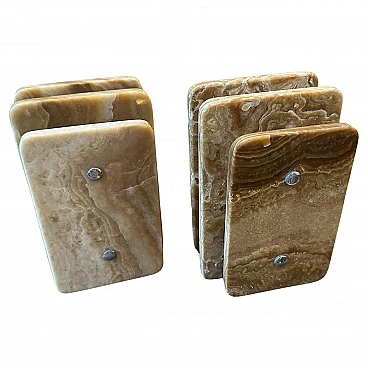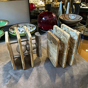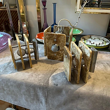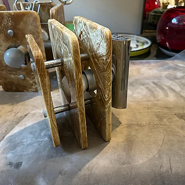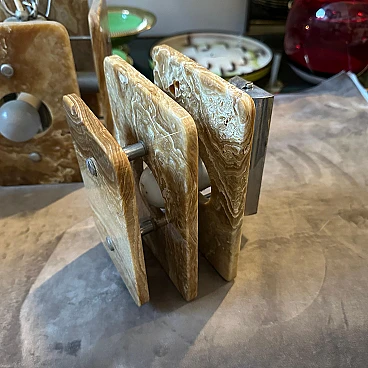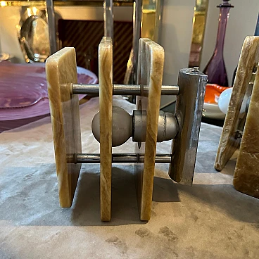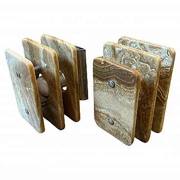 La coppia di appliques italiane rettangolari in marmo onice marrone degli anni '70 che vedi nell'immagine è un elegante esempio di design moderno della metà del secolo scorso con un tocco unico di Space Age. Ogni applique presenta una serie di pannelli rettangolari in marmo onice impilati, che mettono in risalto i toni naturali e le intricate venature della pietra. I pannelli sono disposti in modo da creare profondità e consistenza, aggiungendo interesse visivo alle applique. Il marmo onice ha un colore marrone caldo e ricco,