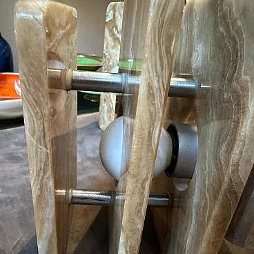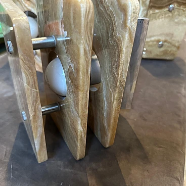 Le applique sono montate su una base di metallo, probabilmente ottone o cromo, che completa la bellezza naturale dell'onice. L'elemento di illuminazione è alloggiato in modo discreto all'interno dei pannelli di marmo, permettendo alla luce di diffondersi dolcemente attraverso la pietra, creando una luce calda