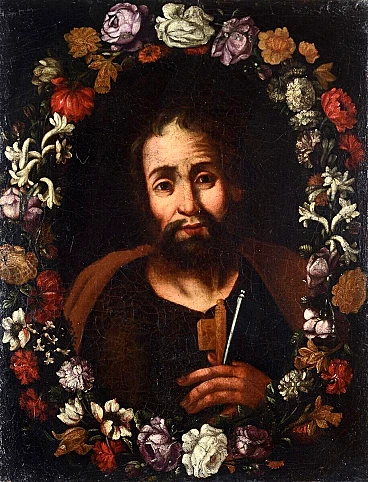 San Pietro entro ghirlanda di fiori, olio su tela, '600