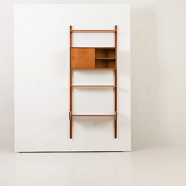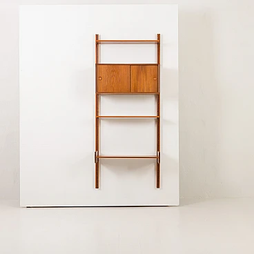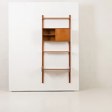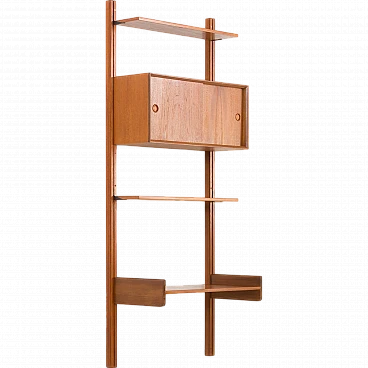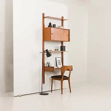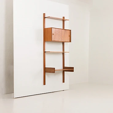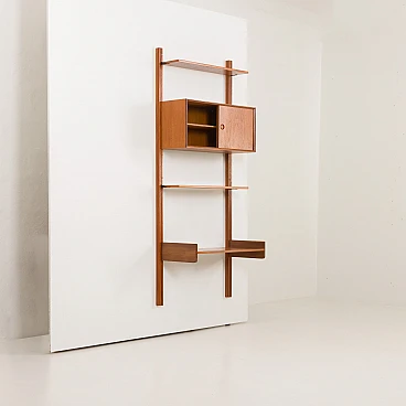Questo pensile in teak per l'home office con mobiletto, progettato da Sven Andersen, è un classico esempio di design danese della metà del secolo degli anni '60. Questa unità è perfetta per aggiungere spazio funzionale ed elegante a qualsiasi soggiorno o camera da letto. Le sue linee eleganti e la calda finitura in teak lo rendono una bella aggiunta a qualsiasi stanza, sia che venga utilizzato come ufficio in casa, come espositore in soggiorno o come elegante organizer in camera da letto. Il pensile è un sistema di scaffalature interamente modulare, che consente di disporre gli elementi secondo necessità. All'interno del mobile è presente anche un ripiano interno.