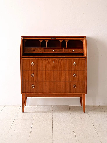 Cassettiera scandinava con ribaltina e scrittoio. Eleganza senza tempo per questo mobile anni '60 realizzato con maestria artigianale che unisce il design minimalista nordico all'atmosfera retrò. Costituito da tre cassetti di cui il primo dotato di serratura, si distingue per la ribaltina che cela tre piccoli cassetti e degli scompartimenti portacarte. Il piano estraibile lo trasforma in una perfetta postazione da lavoro. La sua finitura in legno e i dettagli dorati lo rendono un'aggiunta distintiva per ogni casa alla ricerca di un tocco di stile autentico. Buone condizioni. È stato fatto un restauro conservativo utilizzando materiali naturali. Potrebbe presentare dei segni del tempo. Per piacere presta attenzione alle fotografie.