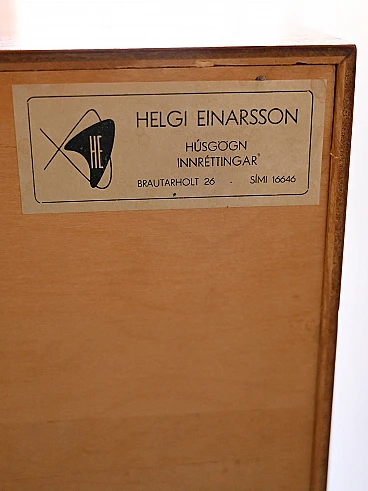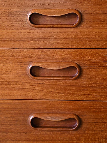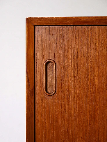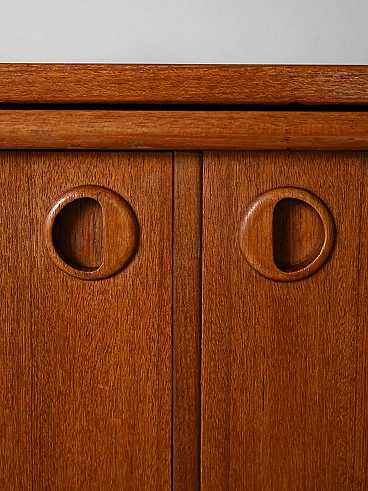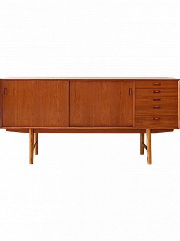 Il mobile è suddiviso in due sezioni: da un lato, due ampie ante scorrevoli in teak celano un vano interno dotato di mensola, perfetto per riporre oggetti o stoviglie. Dall'altro lato, cinque cassetti con maniglie scolpite nel legno offrono spazio aggiuntivo per l'organizzazione. Il design scandinavo del sideboard, con le sue linee pulite lo rende un pezzo d'arredo versatile e adattabile a diversi contesti. Può essere utilizzato come mobile contenitore in sala da pranzo, come credenza in soggiorno o come elemento di arredo in camera da letto. Questa credenza scandinava sarà un elemento d'arredo che arricchirà con stile e funzionalità la tua casa per molti anni a venire. Buone condizioni. È stato fatto un restauro conservativo utilizzando materiali naturali. Potrebbe presentare dei segni del tempo. Per piacere presta attenzione alle fotografie.