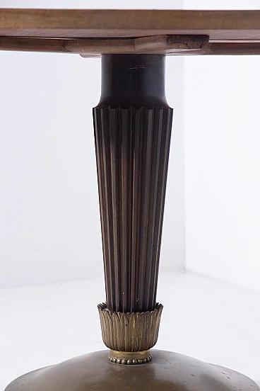 Il tavolo presenta una base scultorea, che combina legno e ottone in un'armonia che riflette l'estetica tipica di Buffa. Gli elementi in ottone, con il loro grazioso invecchiamento e la loro patina, evidenziano l'intricata lavorazione e l'attenzione ai dettagli che contraddistinguono lo stile di Buffa. Il piano circolare del tavolo,