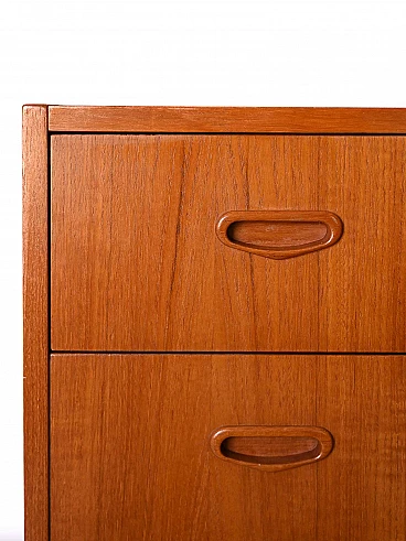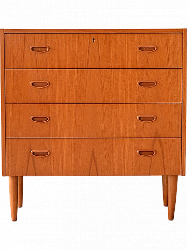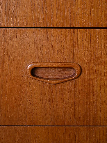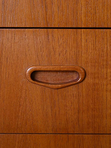 Una cassettiera dalle linee tipiche del design scandinavo di metà secolo. Le maniglie scolpite nel legno aggiungono un dettaglio artistico e un tocco di personalità unica a ogni pezzo. Le gambe coniche affusolate conferiscono un'eleganza sottile e un tocco di leggerezza alla struttura mentre il teak dona calore rendendola un complemento perfetto per qualsiasi arredamento. Il primo cassetto è dotato di una serratura per garantire la sicurezza degli più oggetti preziosi. Con i suoi dettagli curati e la sua bellezza senza tempo, questa cassettiera aggiungerà un tocco di classe e raffinatezza a qualsiasi ambiente. Perfetta per chi cerca un pezzo unico e distintivo da accostare ad arredi moderni.