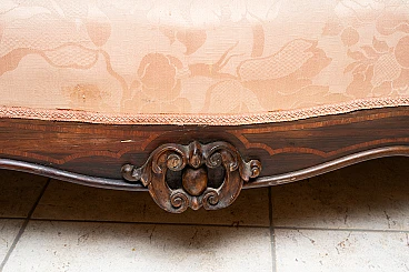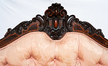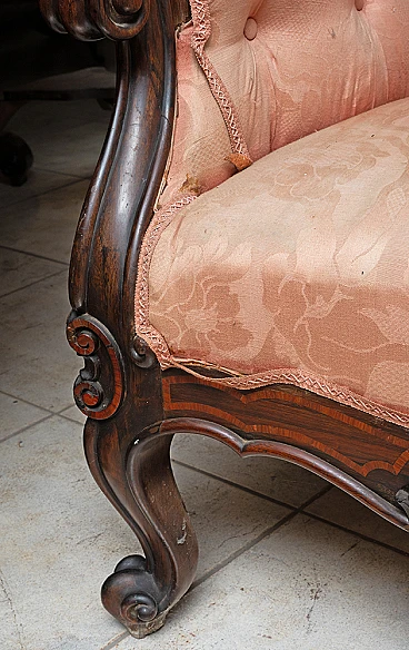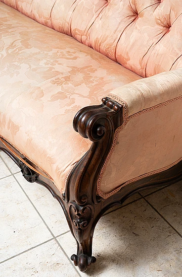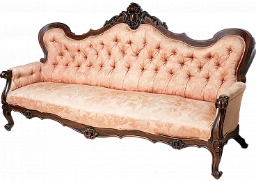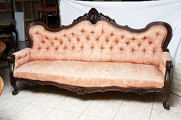 Divano antico Luigi Filippo Napoletano in legni esotici pregiati appartenente alla seconda metà del XIX secolo. Lo schienale ha un contorno arcuato verso l'alto caratterizzato da curve e controcurve interrotto nel tratto centrale da un ricciolo con al centro una riserva in legno pregiati. I braccioli imbottiti terminano in una importante doppia voluta a forma di "esse" intagliata. I due piedi a ricciolo estroflesso sono collegati da un grembiale mistilineo con al centro e sui laterali una cimasa. Provenienza: Napoli (1850/60). Non restaurato ma in buono stato con tappezzeria da sostituire. Misure: 230x75 cm, H 125 cm. Certificato di Autenticità. Siamo a vostra disposizione per ulteriori chiarimenti o particolari fotografici. Spedizione in tutta Italia, Europa e resto del mondo a prezzi molto contenuti in massima sicurezza e tracciabilità. La spedizione sarà concordata privatamente.