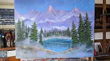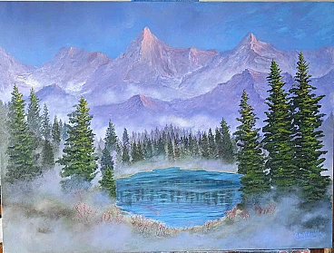 Dolomiti: le montagne sono lontane, delicate, si crogiolano al primo raggio di sole del mattino. Nel lago dai colori tipicamente alpini si specchiano nella nebbia gli alberi del bosco. L'effetto complessivo è di calma, cogliendo la dinamicità dell'alba e l'atmosfera nebbiosa delle Dolomiti della Valle. Il dipinto ha lo scopo di evocare un senso di stupore e meraviglia di fronte alla bellezza delle Dolomiti. La combinazione dell'atmosfera nebbiosa, delle maestose montagne e della foresta crea un senso di tranquillità e serenità. Il dipinto è anche un omaggio alla bellezza del mondo naturale e al potere della natura di ispirarci. Il dipinto dovrebbe evocare anche un senso di tranquillità e serenità, con un tocco di mistero. Lo spettatore dovrebbe provare un senso di connessione con la natura e un senso di stupore per la bellezza della scena.