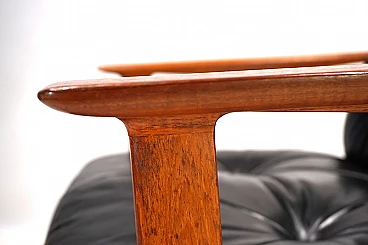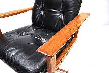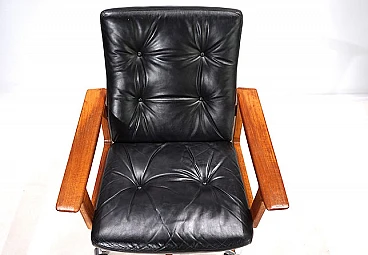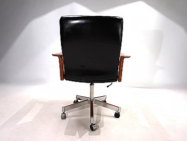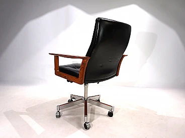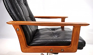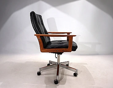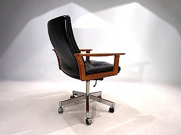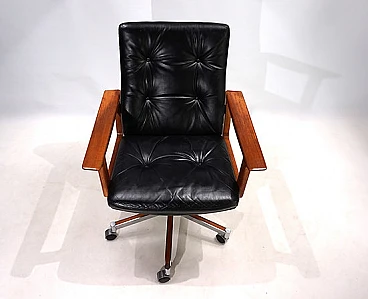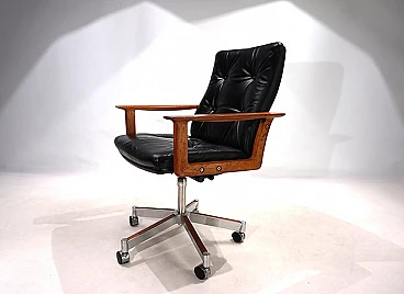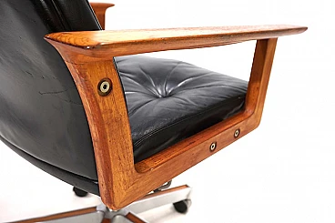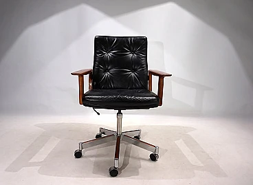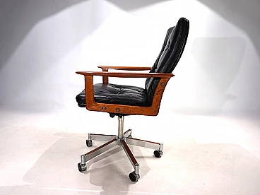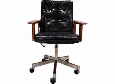 La pelle nera è morbida e presenta minimi segni di usura. I braccioli, realizzati in massello di teak, sono in perfette condizioni e hanno una bellissima tonalità calda del legno che si armonizza bene con la pelle nera. La struttura, realizzata in acciaio inox spazzolato, presenta un dettaglio molto accattivante con i listelli in teak intarsiati. Le ruote girano senza intoppi. La sedia può essere regolata in altezza tramite un meccanismo rotante ed è dotata di meccanismo di rotazione e inclinazione. Sibast è stato uno dei principali produttori danesi di sedute in teak e palissandro di alta qualità e ha collaborato con i designer più alla moda. L'architetto di mobili danese Arne Vodder ha creato diversi progetti popolari per Sibast e ha lavorato a stretto contatto con il suo insegnante e amico Finn Juhl.