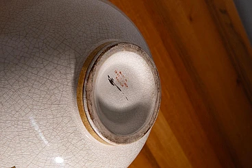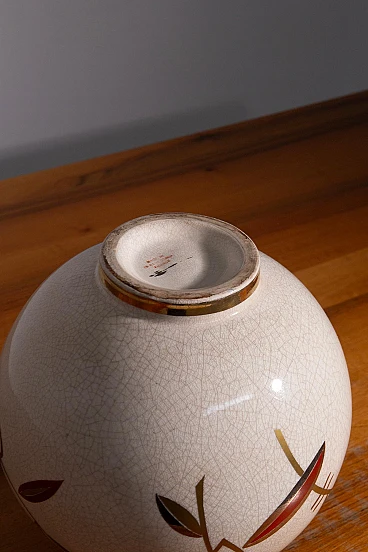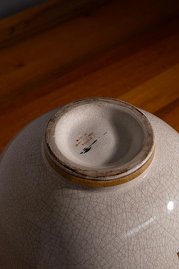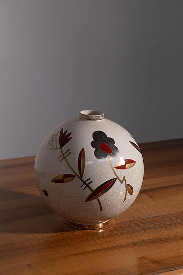 Scoprite l'eleganza e il fascino del periodo Art Déco francese con questo splendido vaso di Sainte Radegonde. Realizzato in Francia intorno al 1925, questo squisito pezzo è una testimonianza della ricca espressione artistica dell'epoca. Il vaso presenta un corpo in ceramica bianca che contrasta splendidamente con le decorazioni floreali stilizzate in rosso, oro e argento, catturando l'estetica sontuosa e al tempo stesso snella del movimento Art Déco. La forma rotonda ed elegante del vaso è completata dai vivaci motivi geometrici che adornano la sua superficie, ogni dettaglio reso meticoloso per mostrare la maestria artigianale del suo tempo. Ideale per i collezionisti e gli appassionati di arredamento vintage, questo pezzo non solo aggiunge un tocco di lusso francese degli anni Venti a qualsiasi ambiente, ma possiede anche il fascino dell'artigianato storico. In termini di condizioni, il vaso è ben conservato e presenta segni di usura coerenti con l'età, che ne aumentano l'autenticità e il fascino vintage. Questo pezzo di storia non è solo un oggetto decorativo ma un ponte verso un'epoca passata, perfetto per arricchire qualsiasi collezione o per abbellire qualsiasi casa moderna con una storia unica e uno stile senza tempo.