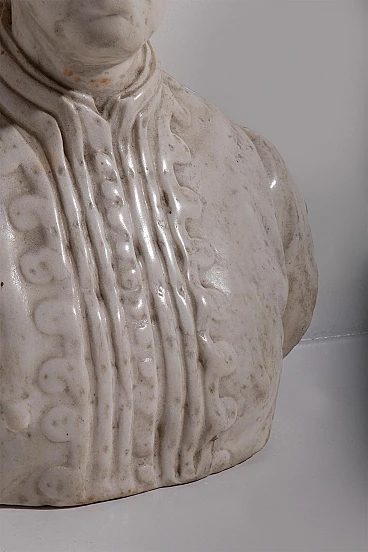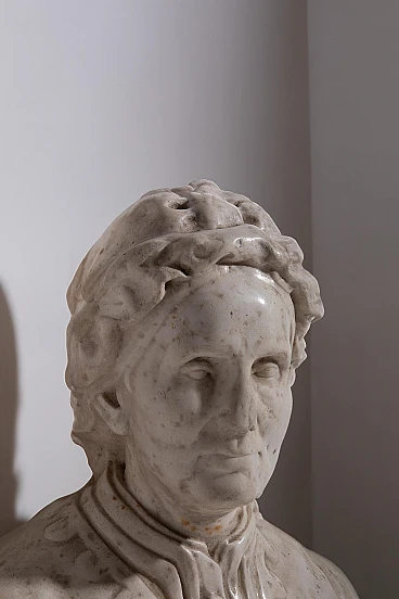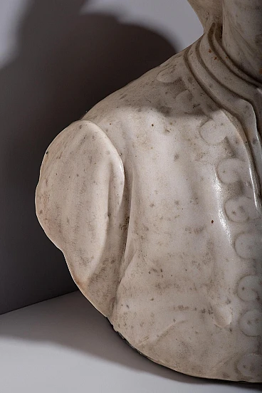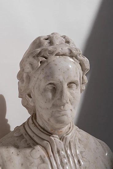 Questo straordinario busto in marmo del XIX secolo è un sublime esempio di scultura classica, arricchito da un affascinante realismo. L'artigiano ha abilmente infuso la vita nel marmo, catturando con maestria i tratti del volto del soggetto, dalle rughe dettagliate all'espressione serena e contemplativa. Ogni linea e curva è realizzata con precisione, riflettendo l'eccellenza artistica dell'epoca. Il busto vanta incredibili dettagli, dalle pieghe della veste ai riccioli dei capelli, esaltati dalla luce naturale sulla superficie di marmo lucidata. La scelta del marmo bianco, con le sue delicate venature, conferisce all'opera un'eleganza senza tempo. Quest'opera non è una semplice scultura, ma una rappresentazione tangibile della bellezza classica, capace di suscitare emozioni e ammirazione. Il marmo levigato esalta ogni dettaglio, conferendo al busto una presenza maestosa e raffinata che si adatta perfettamente a qualsiasi ambiente. Nel XIX secolo la scultura classica ha conosciuto una rinascita influenzata dal Neoclassicismo e dalla riscoperta delle antiche tecniche romane e greche. Questo busto è una testimonianza di quel periodo e riflette la ricerca di armonia, proporzione e bellezza ideale. Tali opere erano spesso commissionate da nobili e collezionisti per abbellire le loro case e dimostrare il loro gusto raffinato e la loro cultura. La scelta del soggetto, l'abbigliamento dettagliato e l'espressione serena del viso rivelano l'importanza e la dignità del personaggio ritratto, offrendo uno sguardo affascinante sul mondo aristocratico del XIX secolo.