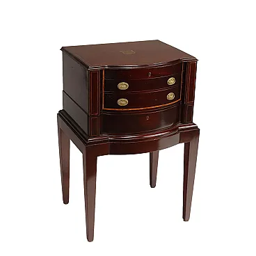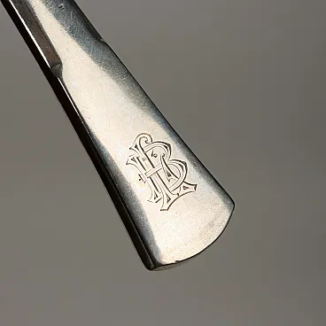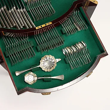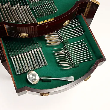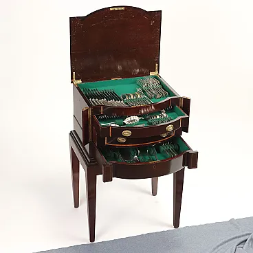 Servizio di posate in argento con iniziali incise sui manici, composto da 16 posate a servire, 12 cucchiai, 12 forchette, 12 coltelli, 12 forchette da frutta, 12 coltelli da frutta, 12 cucchiai da dolce, 12 forchette da dolce, 12 coltellini da dolce, 12 cucchiaini da caffè. Grammi 6035 al netto dei 24 coltelli. Marchi dell'argento incussi. Il servizio è custodito in un mobile in mogano con fronte mosso a tre cassetti, il cui piano, abbellito da un inserto in ottone, è apribile e cela un ulteriore vano portaposate. Il corpo può essere separato dalle gambe troncopiramidali. Fronte e piano della piccola cassettiera sono abbelliti da filettature in acero e legno scuro, mentre solo il primo presenta una bordura in bois de rose. Sui lati del fronte due piccoli sportelli permettono di bloccare i cassetti. Serrature marchiate Lever ed etichetta interna riportante il nome della manifattura "James Weir Jeweller & Silversmith 66 Buchanan Street Glasgow".