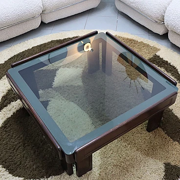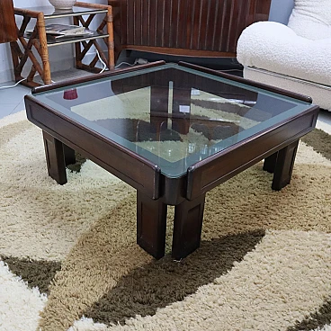 Tavolino quadrato in mogano e vetro in stile A. e T. Scarpa, anni '70