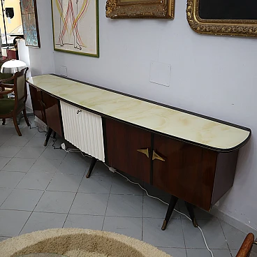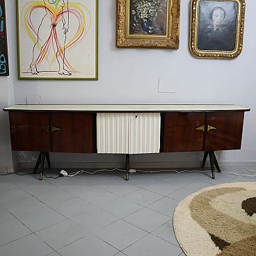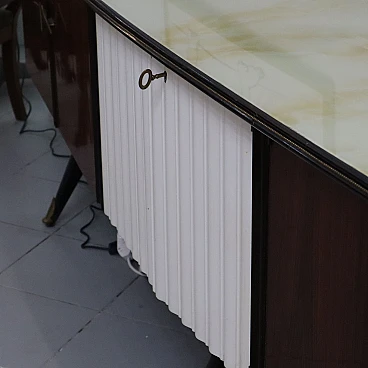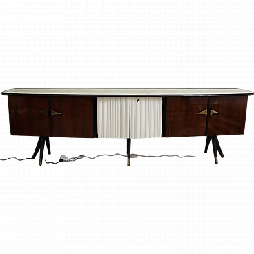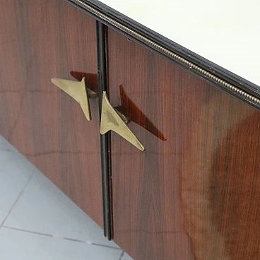 Le maniglie in ottone aggiungono un tocco di lusso, mentre i pannelli in palissandro degli sportelli laterali offrono calore e profondità visiva. Le ante centrali laccate in bianco creano un contrasto sofisticato e moderno, completato da un piano in vetro originale che preserva l’autenticità del pezzo.