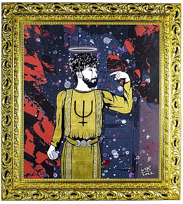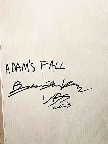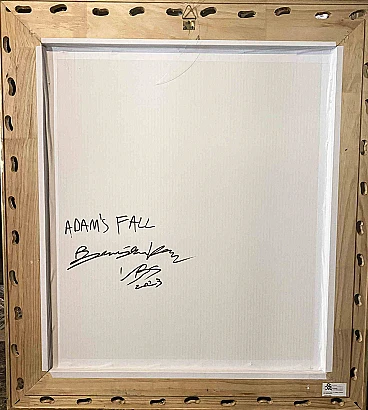Adam's Fall è l'opera d'arte contemporanea realizzata da LBS (A.K.A. Bruno Salvatore Latella) negli anni 2020. Pittura a olio su stampa giclée su carta Washi giapponese. Titolo sul retro dell'opera. Firmato a mano dall'artista. Instagram Descrizione concettuale: L'opera d'arte ADAM'S FALL, realizzata in tecnica mista su JAPThe JAPANESE WASHI PAPER, intende rappresentare quello che ANESE potrebbe ossimoronicamente essere considerato il triste autunno di oggi. Ambientato, in relazione all'opera La Primavera di Eva, in un tetro GIARDINO DELL'EDEN, si staglia il nostro contemporaneo ADAM, vestito con uno splendido, opulento abito dorato ancora fresco con cartellino 'purbello, acquisto', e tenendo in mano il famoso frutto di insegui' l'Eden, dimostrando attraverso le sue lacrime sanguinanti come, forse, il problema teologico cristiano fosse cretino, forse creato non dalla donna ma dall'uomo. Sullo sfondo una porta chiusa, senza maniglia, una porta che deve rimanere sempre chiusa a chiave! LBS (A.K.A. Bruno Salvatore Latella), artista visivo nato a Reggio Calabria nel 1999, ha conseguito la Laurea Magistrale in Scienze della Formazione Primaria. Dalla musica classica all'arte visiva, LBS combina in modo unico gli studi pedagogici umanistici con la sua produzione artistica, trasformando idee e visioni in accattivanti opere d'arte. Posizionata all'intersezione tra pedagogia e artivismo, LBS ha rapidamente guadagnato notorietà, collezionando premi prestigiosi. La sua arte di strada potente e socialmente critica ha ricevuto ampi riconoscimenti e apparizioni nei media nazionali. LBS affronta coraggiosamente le questioni sociali, invitando lo spettatore a confrontarsi apertamente con le sfide del mondo contemporaneo. La sua visione unica si fonde con l'artivismo nella "super-società liquida", esplorando simbolicamente la società contemporanea e la mancanza di sogni e certezze. Con una tecnica che combina fotografia, disegno digitale, design con stampa fine art e pittura, LBS trae ispirazione da vari movimenti artistici, creando un linguaggio visivo tagliente. Le sue opere comunicano un messaggio concettuale e sociale, con un profilo pedagogico che riflette il suo background accademico. LBS è stato protagonista di importanti mostre e pubblicazioni, con una crescita costante nella sua carriera artistica. Preparati a lasciarti affascinare da LBS, un artista che usa l'arte come catalizzatore del cambiamento, invocando la nostra umanità e offrendo una luminosa speranza per il futuro.lbs__artist