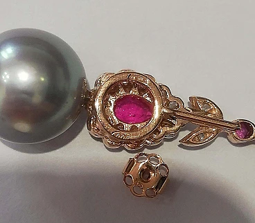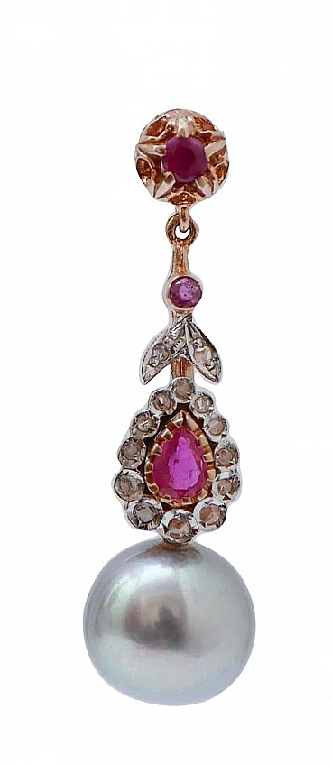 Coppia di Orecchini in oro rosa e argento con perle, rubini e diamanti