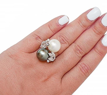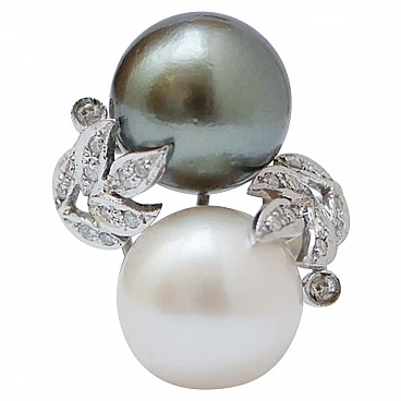 Incredibile anello con struttura in platino montato con una perla bianca e una perla di Tahiti e, lateralmente, foglie tempestate di diamanti. Questo anello è stato realizzato totalmente a mano da maestri orafi italiani ed è in perfette condizioni. Diamanti 0.24 ct. Perla Whiting 2,60 gr -12 mm Perla Tahiti 2,50 gr - 12 mm.