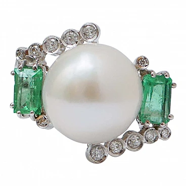 Anello in platino con perla bianca, smeraldi e diamanti, anni '70