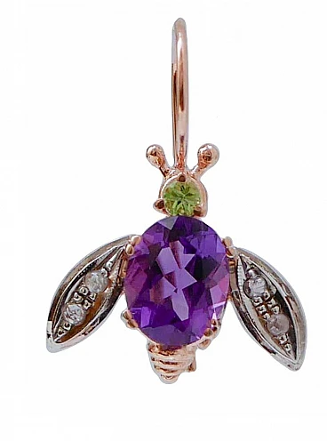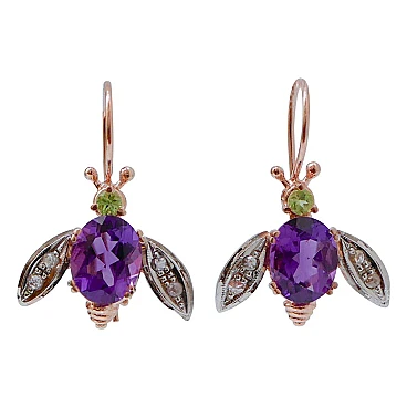 Particolari orecchini a forma di mosca in oro rosa 9kt e struttura in argento montata con un peridoto sulla testa; il corpo è montato con un'ametista idrotermale e le ali sono tempestate di diamanti.