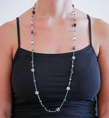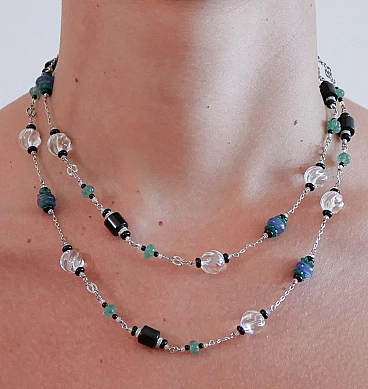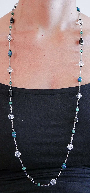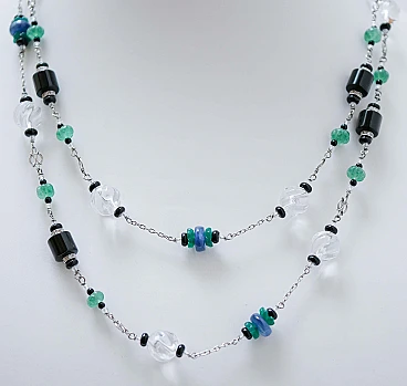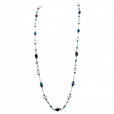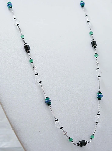 Fantastica collana in platino struttura montata con sezioni di agata verde, agata nera, cianite, quarzo e cristallo di rocca. Tra loro, una piccola struttura in oro bianco 9 kt tempestata di diamanti.