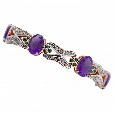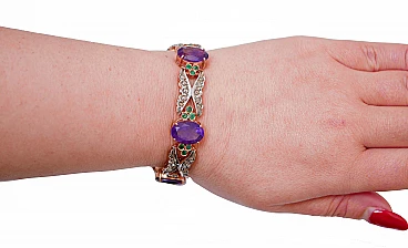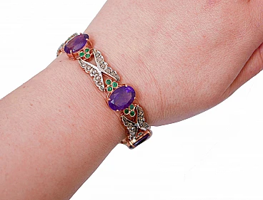 Bracciale oro rosa e argento, ametiste, smeraldi, diamanti, anni '70